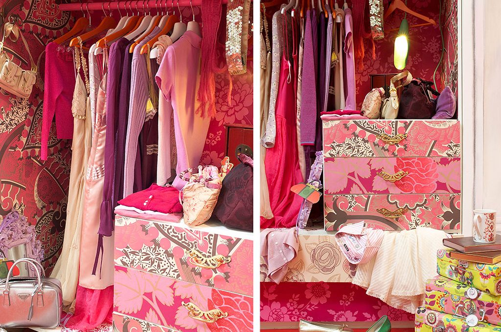 Passa ora all’esterno della nicchia e crea da sola, o fatti aiutare da qualcuno più esperto, una cornice a trompe-l’oeil che simula gli stipiti di una porta d’epoca, in modo da sottolineare elegantemente il tuo guardaroba.