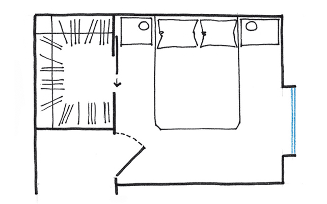 Progetto 8: cabina di fianco al letto al posto del ripostiglio. Se la camera confina con lo sgabuzzino, questo si può chiudere dalla parte del corridoio e aprire sulla stanza in modo da trasformarlo in cabina armadio (cm 150x200) organizzata a ‘C’. Così, annettendo la cabina, la stanza da singola (cm 300x300) diventa matrimoniale (perché le loro metrature si sommano).