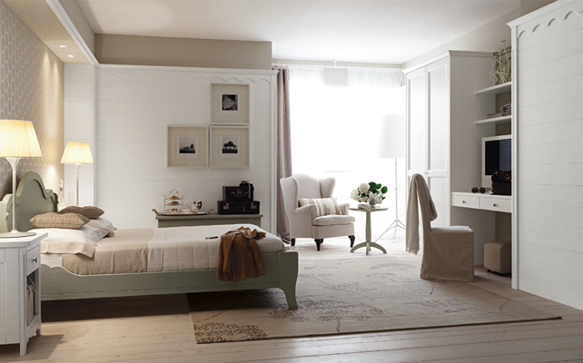 In questa stanza la cabina è stata ricavata tra letto e finestra. In questo modo, si crea anche un angolo lettura illuminato naturalmente. In più, c’è posto per un secondo armadio e una zona studio. L’interno della cabina, Nuovo Mondo, disposto a ‘L’ è in legno massello tinto bianco [Scandola].