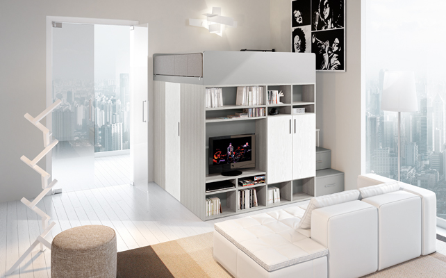 La cabina sotto il letto: Modus Container è il sistema che consente di sfruttare lo spazio sotto e intorno al letto in base alle singole esigenze con: scale a cassetti laterali, un grande vano con appenderia più ripiani, accessibile sollevando la rete a doghe, e, se serve, un armadio-libreria retrotestata [Dielle, cm 270x221x100/152h].