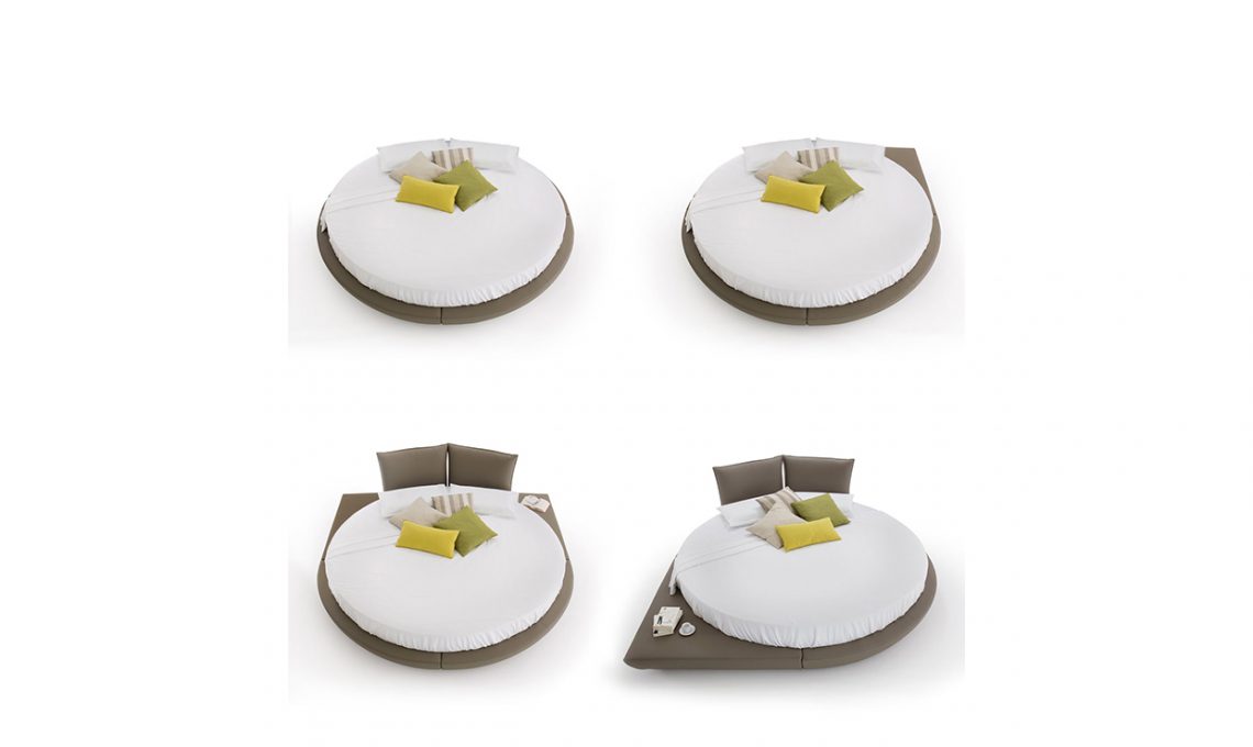 IL LETTO ROTONDO CHE STA (ANCHE) NELL’ANGOLO. In tessuto o ecopelle, il letto Soleil è attrezzato con due comodi cuscini di testiera reclinabili e liberamente posizionabili e può essere dotato di uno o più elementi ‘a penisola’ che ne permettono il posizionamento anche a parete o ad angolo [HomePlaneur, ø cm 260x260x85,6h €1.941].