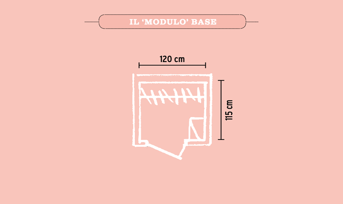 Presta attenzione all’ergonomia. La profondità dei moduli per ripiani e appenderia è di cm 55/60, lo spazio davanti per muoversi e riporre o prendere i vestiti è di cm 60. La profondità minima sarà quindi di 115 cm, la larghezza utile parte da un minimo di cm 120.