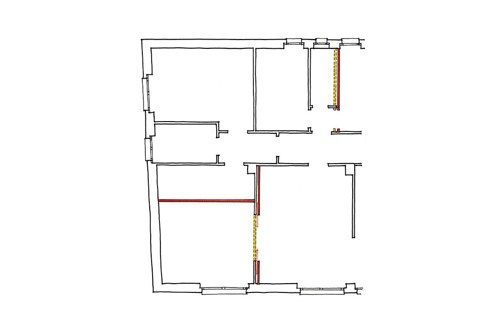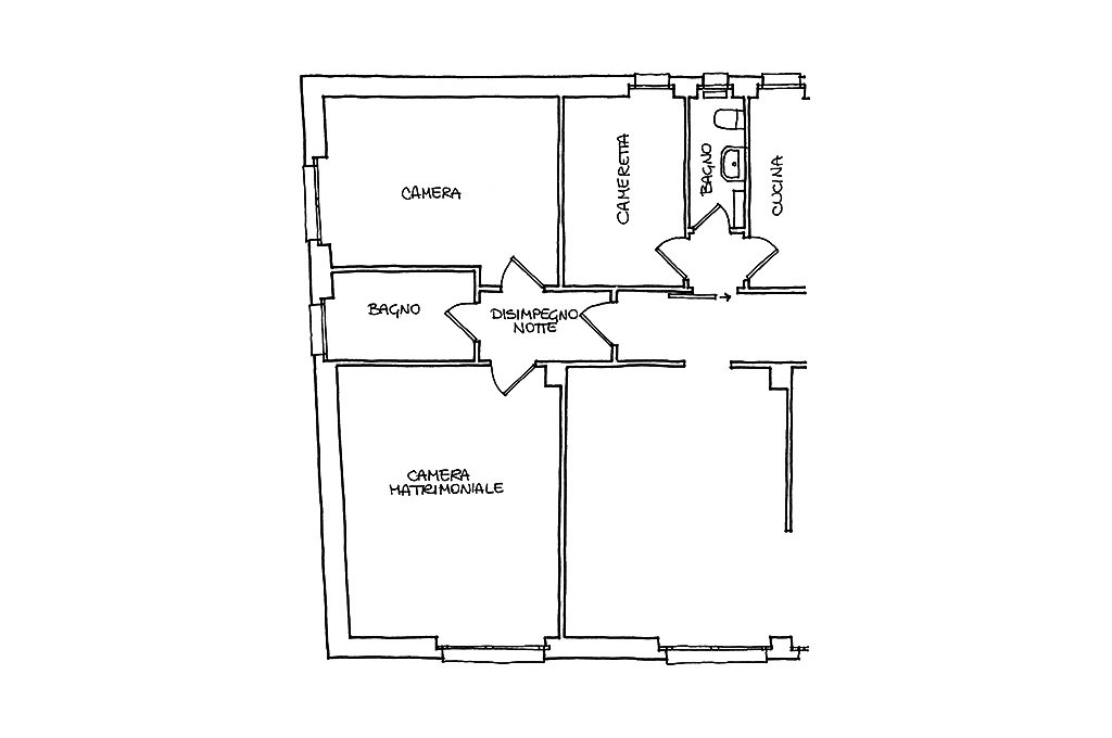 Per quanto riguarda il bagno è necessario allargarlo almeno a cm 110-120, a scapito della cucina. Sarà attrezzato con una doccia a tutta larghezza sotto la finestra, wc, bidet e lavabo. Il termosifone sotto la finestra sarà sostituito da uno scaldasalviette e la porta a battente con una pieghevole.