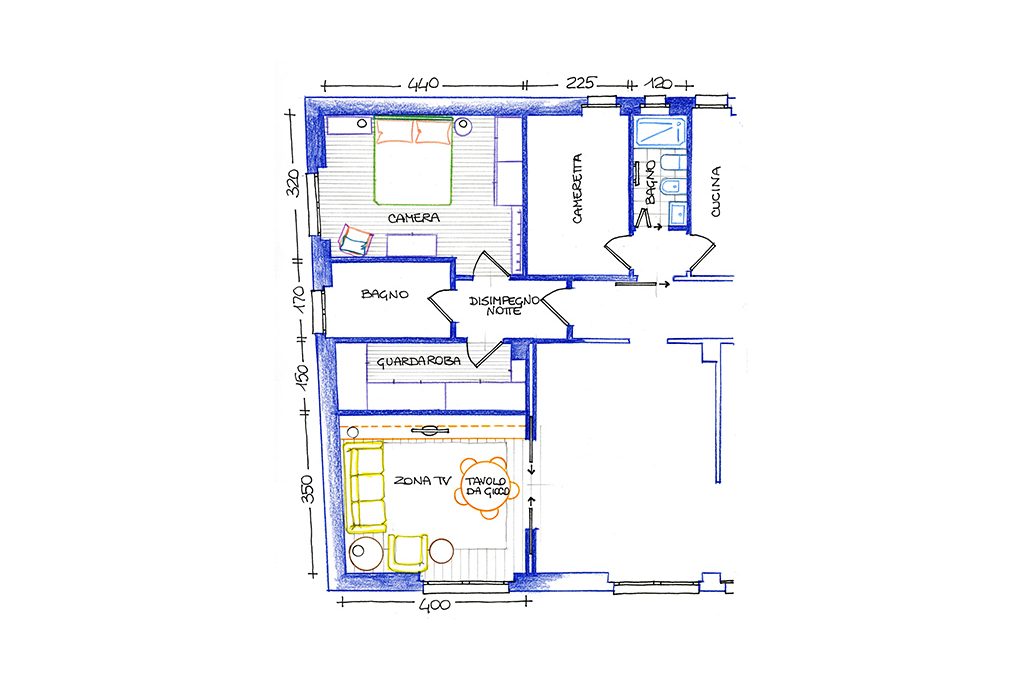 Nel nuovo salottino tv è prevista un’apertura larga 2 metri, al centro della parete verso il soggiorno adiacente. Sarà chiudibile con 2 porte scorrevoli che potranno essere a vista, incassate a scomparsa rifacendo l’attuale parete, oppure mascherate da una controparete in cartongesso, come indicato nel disegno. Per l’arredamento suggeriamo un'intera parete attrezzata a libreria, lungo la parete adiacente la cabina armadio; un divano a tre posti e una poltrona, oltre al tavolo rotondo da gioco, con diametro di cm 110.