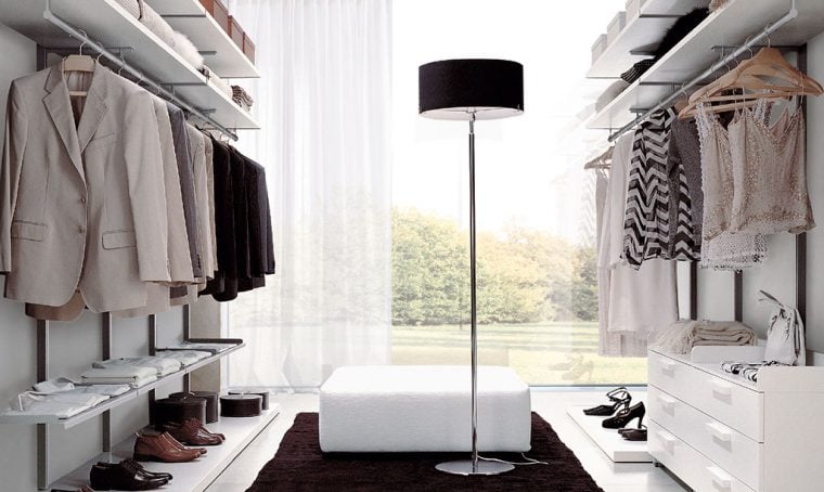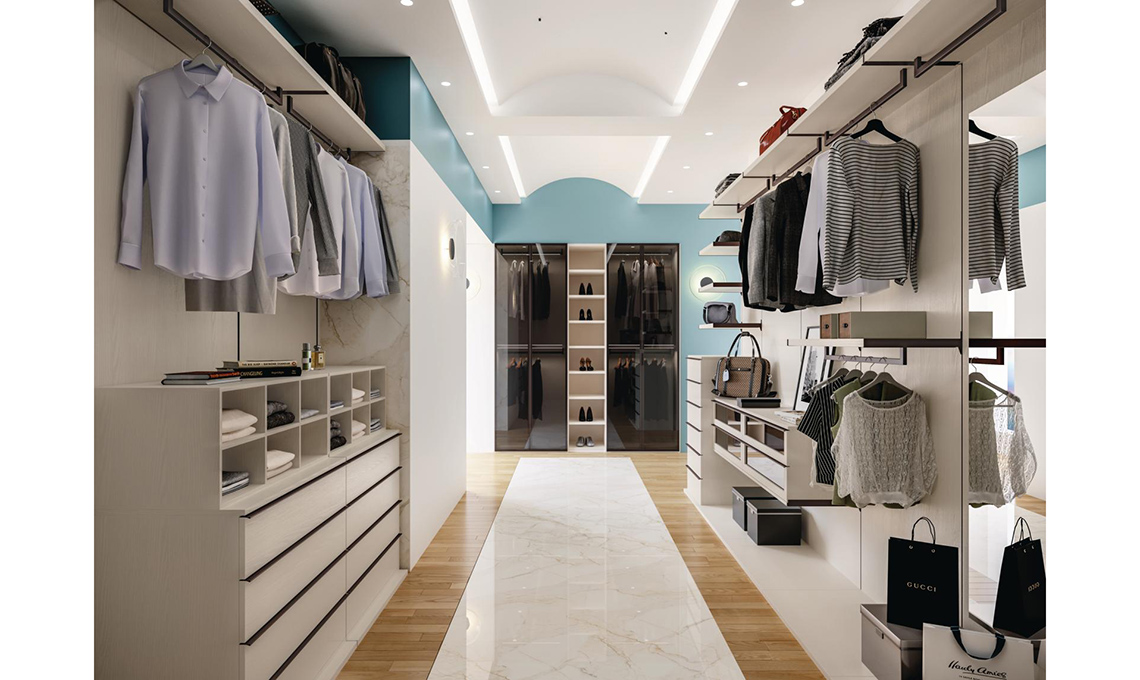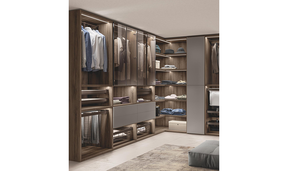 Nella cabina armadio i contenitori possono essere a spalla, cioè dotati di una struttura simile a quella degli armadi ma priva di ante; o a pannelli, cioè una struttura aperta con boiserie dotata di cremagliera su cui fissare ripiani e accessori. Per i tuoi capi più preziosi, puoi chiudere alcuni elementi con ante a vetro. Ricorda che la profondità minima per una cabina comoda è 120 cm.