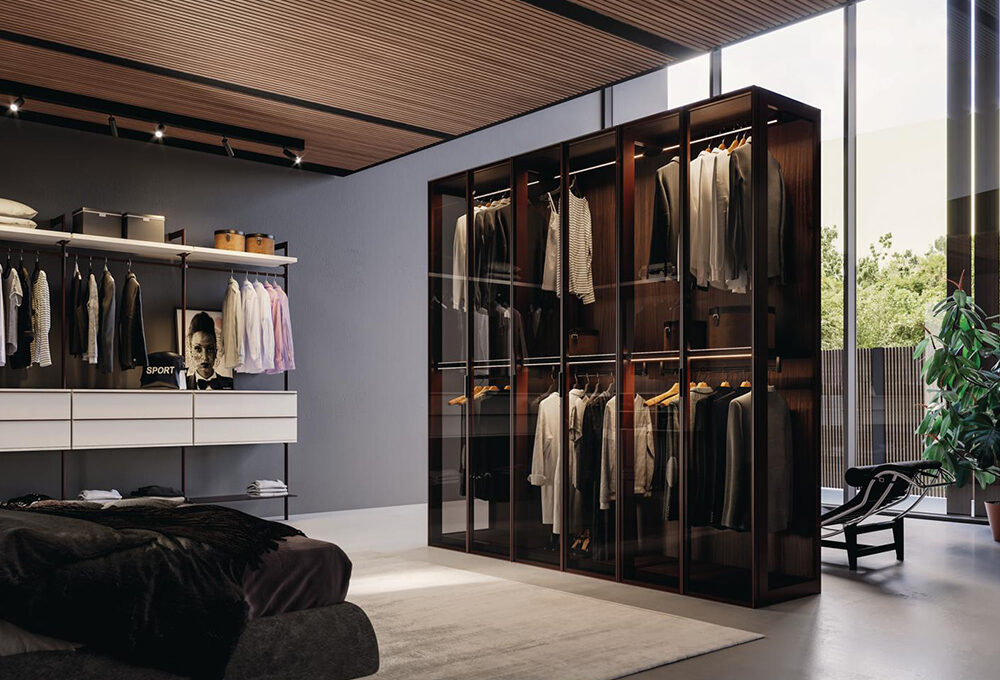 composto dall’armadio con ante a battente in Vetro Reflex Jerry [cm 233,8x61x262h] e dalla cabina a pannelli Boiserie Sabbia Frassinato e Brown, accessoriabile con specchio, cassettiere, appenderie
