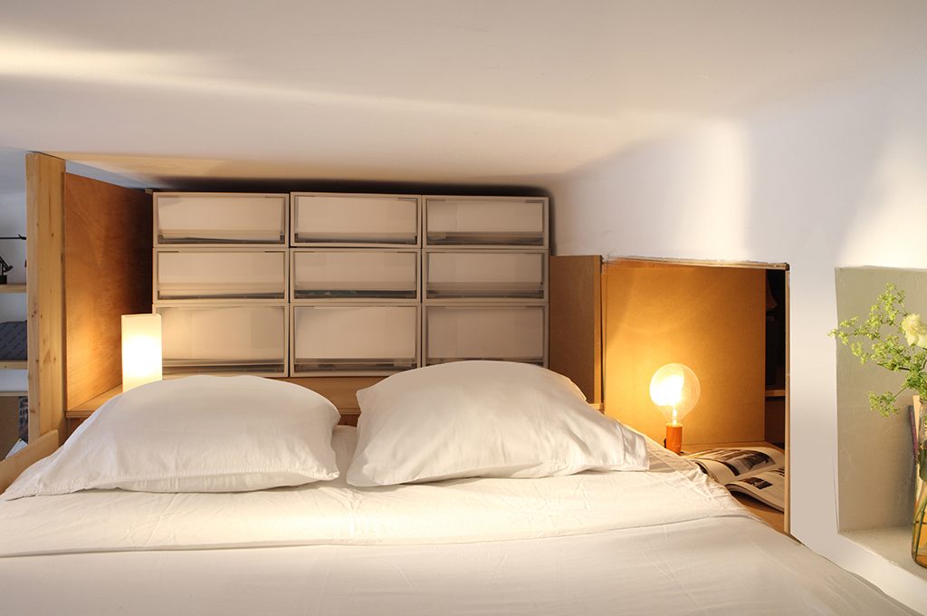 La testiera perfetta per il letto sul soppalco è 'attrezzata' con contenitori. Qui sono i cassetti in plastica di Muji. Leggeri, comodissimi, creano un disegno grafico che ricorda le pareti di carta giapponesi