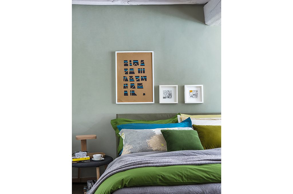 Letto con testiera semplice e parete dipinta in toni soft: è lo sfondo perfetto per giocare con i quadri. La regola? Scegli una ordinata asimmetria (qui un quadro grande e due piccoli uguali). Il poster grande è Scrittura [Danese]