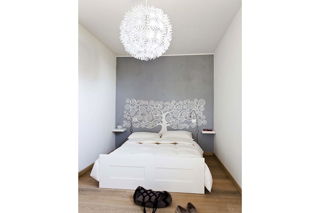 La testiera fai-da-te è realizzata con un adesivo della collezione I Rilievi di Candis. Si può scegliere tra diversi decori, sempre bianci ma colorabili a piacere » candis.it/it/rilievi.php