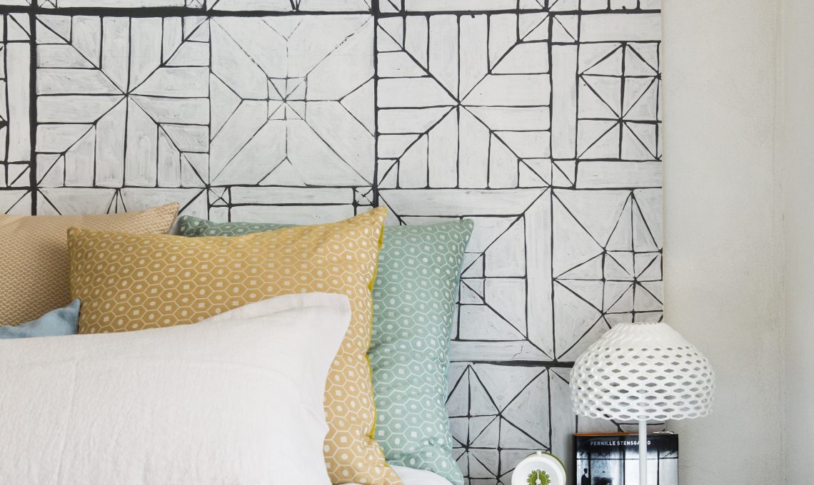 Qui la carta da parati decora un pannello in compensato psoto dietro il letto. Una scelta economica, easy e di grande effetto. La carta da parati è Tuuli [Marimekko by Sirpi, cm 300x140h].