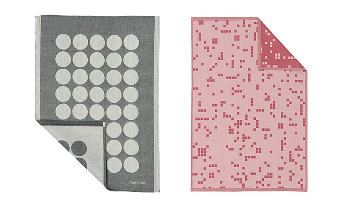 Maxi pois e cotone organico [Pappelina €18]. Un contemporaneo effetto pixel sull’asciugapiatti pink [Normann Copenhagen €14].