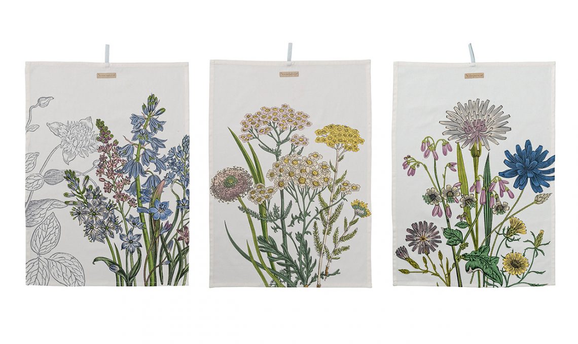 Sembrano usciti da un erbario il canovaccio in fiore [Bloomingville, €25 il set da 3].