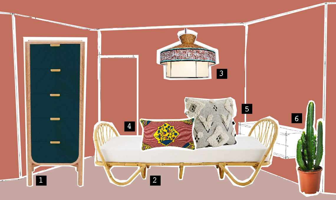 1 - Cassettiera Marius Blu petrolio [Hartô, h130 cm, 120x45x130 cm, a partire da € 1.473], 2 - Panca letto in rattan Suzane [Maisons du Monde, 21x44 cm, € 299], 3 - lampada da soffitto Giardino #3 [Servomuto, diametro 65 cm. h. 49 cm, € 3.580], 4 - Cuscino Constantine [Maison Malou, 50 x 30 cm., € 66], 5 - Copri cuscino Etnico Pompons in cotone [Madam Stoltz, 50 x 50 cm., € 54], 6 - Pianta da vaso [Ikea, € 49,95]