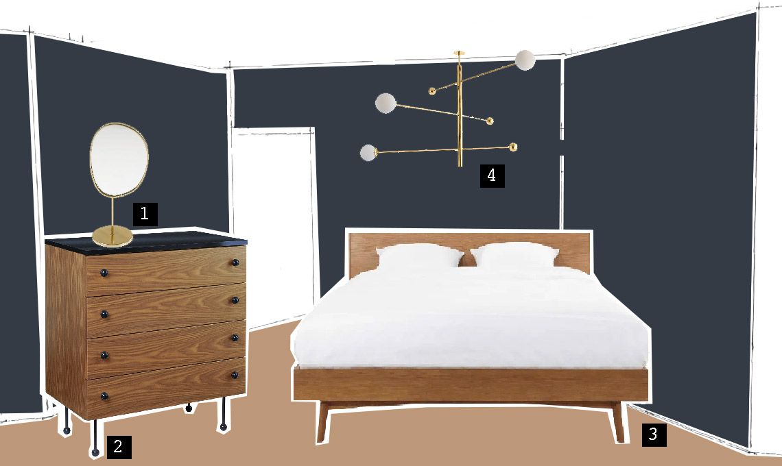 1 - Specchio da tavolo in metallo Montebello [Maisons du Monde, 21x44 cm, € 64,99], 2 - Cassettiera alta a 4 cassetti in legno di noce, Greta M. Grossman, 1952 Marrone [Gubi, 280 x 45 x 89h. cm, € 2.732], 3 - letto in quercia Portobello [Maisons du Monde, h90 x L170 x P212, € 499], 4 - Chandelier 08 versione 2 [Magic Circus, h90 x 1560, prezzo su richiesta].