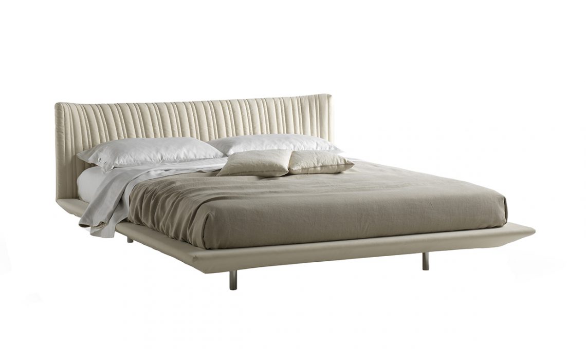 Sembra fluttuare nell’aria il letto Shellon, grazie al giroletto svasato verso l’alto e alla testata ricurva e impunturata verticalmente [Désirée, cm 188x238x88h €2.150].