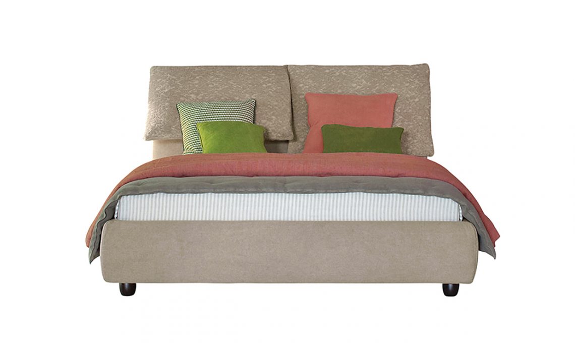 Sandy 0.60, caratterizzato dall’ampio box sottorete, ha un’unica maxi cuscinatura fissata alla testata [Bontempi Casa Letti Design, cm 185x227x111h €1.369].