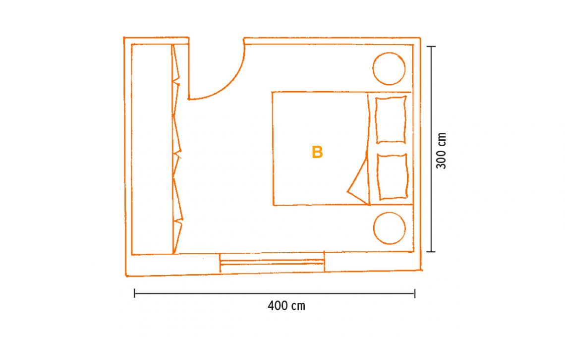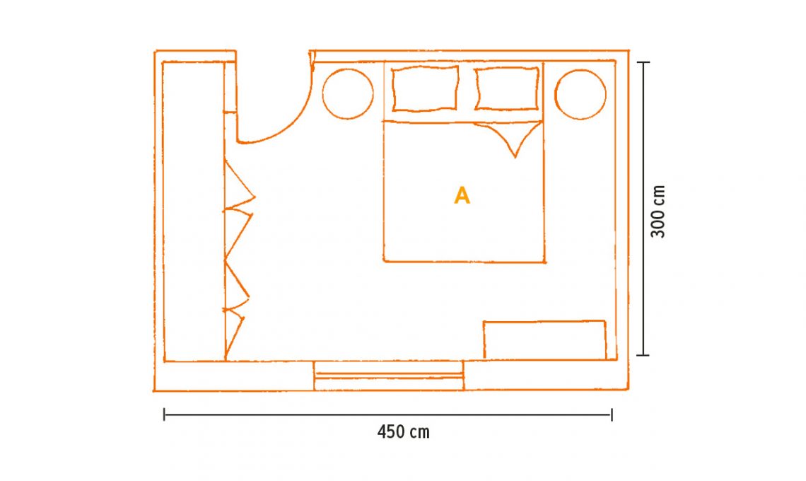 Progetto A: la stanza è larga ben 4,5 metri quindi l’armadio si mette dietro la porta e il letto lungo la parete maggiore, di fronte alla finestra. Ci sta anche un cassettone.