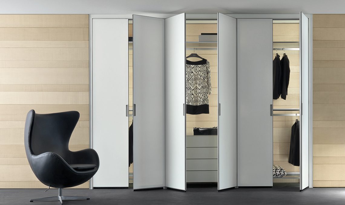 Con l’armadio è l’attrezzatura (cassetti, ripiani scorrevoli, portapantaloni...) che ‘viene’ verso di te; e nei modelli in cui è parte strutturale delle ante, è il guardaroba che ‘esce’ letteralmente.