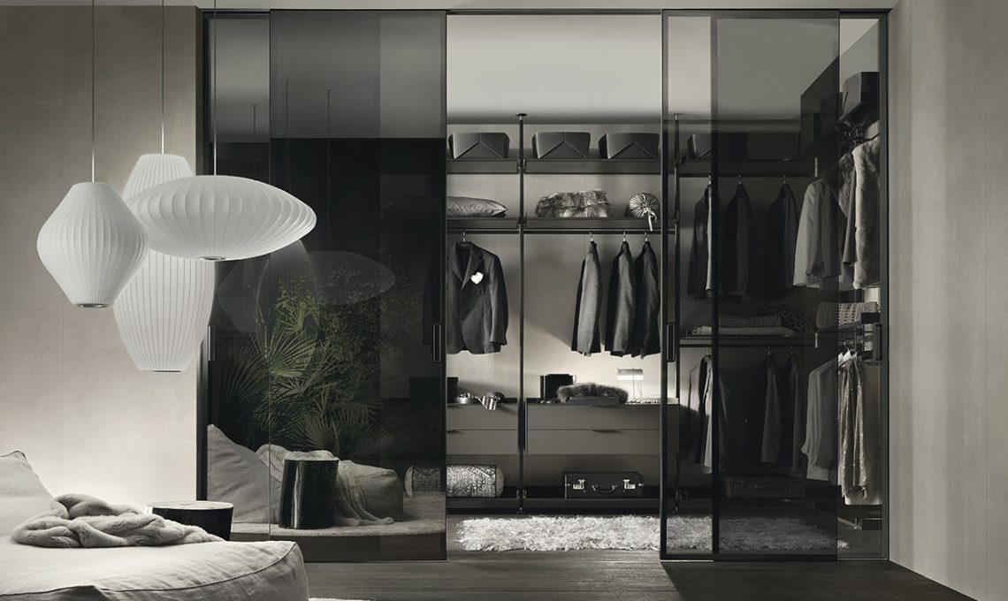 Cabina armadio Zenit con grande versatilità compositiva. Ogni elemento è posizionabile a piacere e accessoriabile secondo i propri gusti, misure e finiture desiderate [Rimadesio, misure e prezzo su progetto].