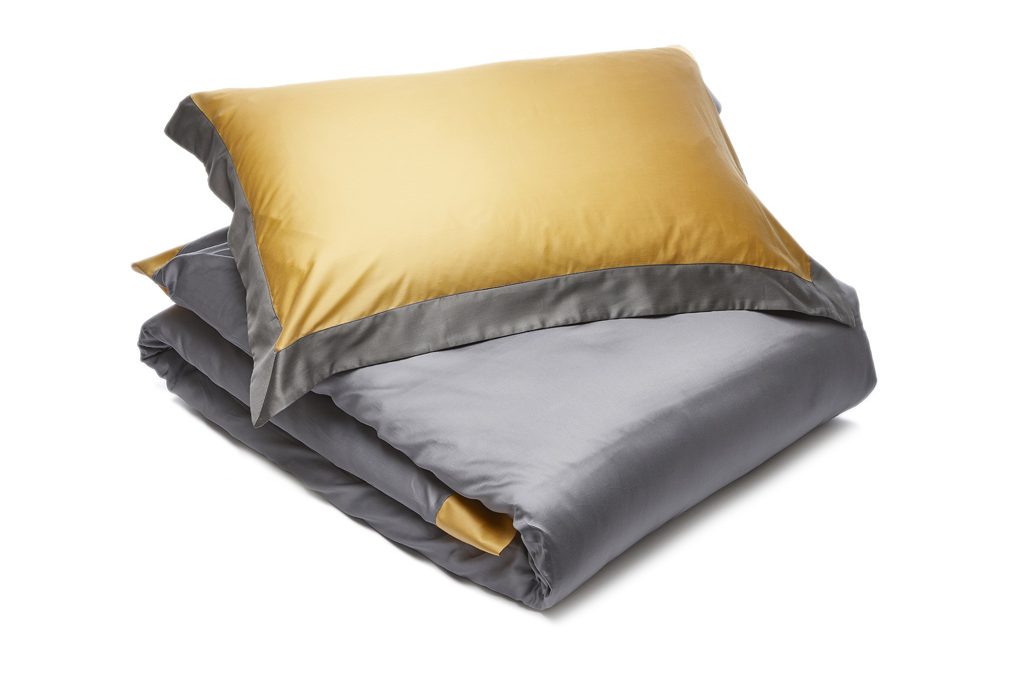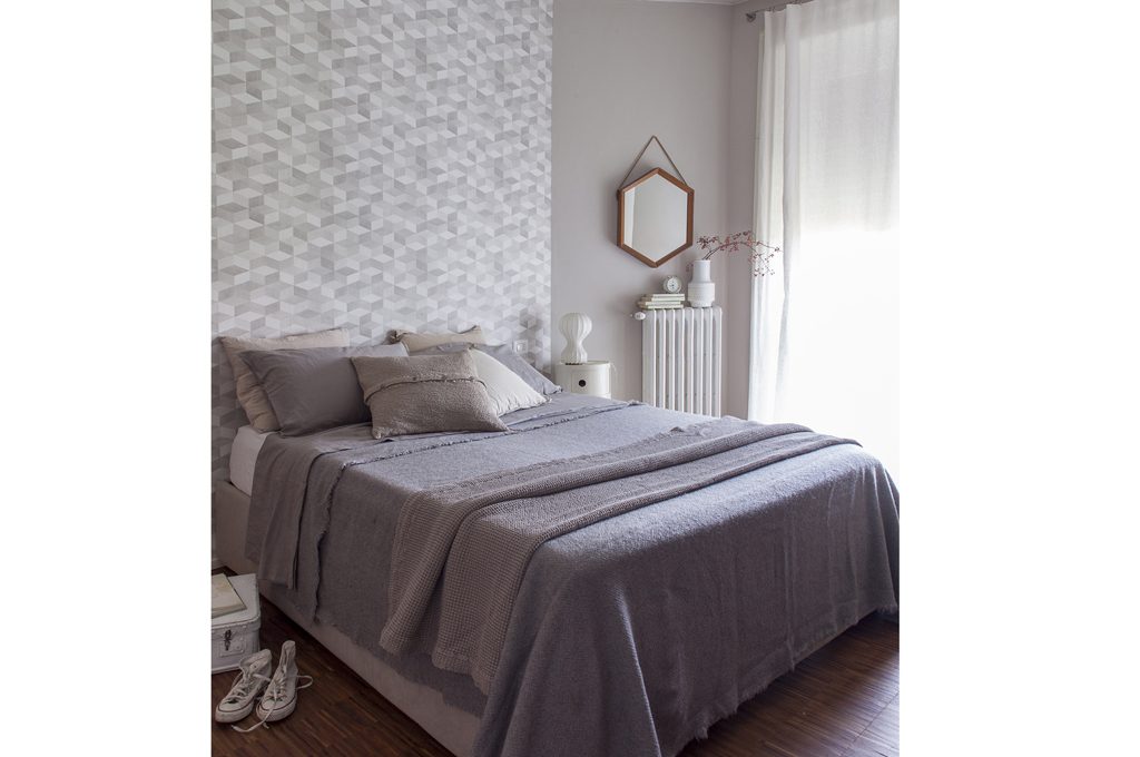Tono su tono, molto rilassante nella palette 'polverosa' del grigio e del sabbia. Dietro al letto carta da parati Jeans Cube (Eco Wallpaper euro 42 il rotolo), lenzuola Lite-Light in lino e copriletto Nettare (tutto di Fazzini), lampada Flos, comodino Kartell.