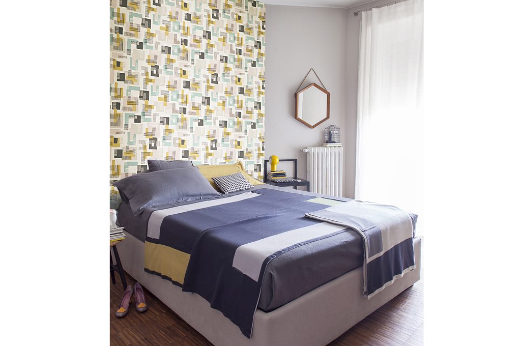 Fresco e moderno è tutto giocato sui motivi grafici dei tessuti e della carta da parati (Etta di Villa Nova) nei toni del grigio, blu e giallo lime. Mix di colori per la parure di lenzuola Soffio (Fazzini, euro 195), coperte in lana (Roberta Licini, euro 275 l'una), lampada Valenti.