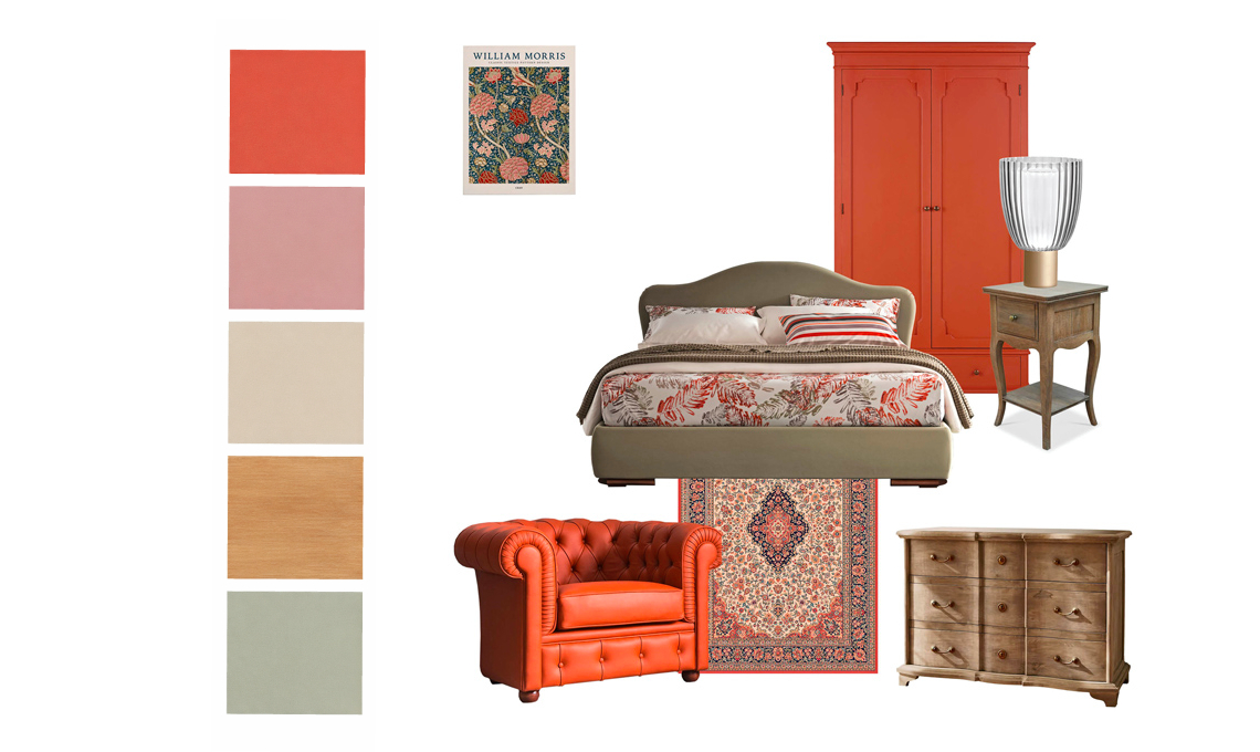 NELLA MOODBOARD: Stampa William Morris Cray [Poster Store, cm 50x70]. Armadio con cornici e bugne Selena color terracotta con due ante e cassettone alla base [Maisons du Monde, cm 104x50x190h]. Letto matrimoniale sfoderabile Itaca qui rivestito in tessuto 001EA con testiera sagomata a doppia onda [Altrenotti, cm 182x212/222x113h compreso di piano da riposo ergonomico, materasso, piumino e set coordinato]. Lampada da tavolo Universale con base in metallo finitura champagne e diffusore in vetro cannettato [Italamp, ø cm 30x44h]. Comodino in legno di mango Bais con cassetto e ripiano più gambe tornite a mano [Loberon, cm 35x35x59h]. Poltrona Battista rivestita in pelle color marrone con schienale avvolgente e base decorate capitonné [Dondi Salotti, cm 110x87x70h]. Tappeto Hali dal disegno persiano classico in bianco, rosso e blu [Sitap, cm 137x 195]. Comò Aiguillon con cassetti e profili modanati in legno di mango anticato, più maniglie in metallo [Loberon, cm 120x55x85h].