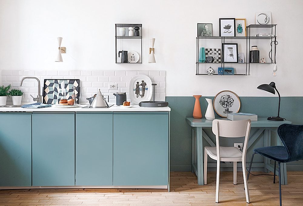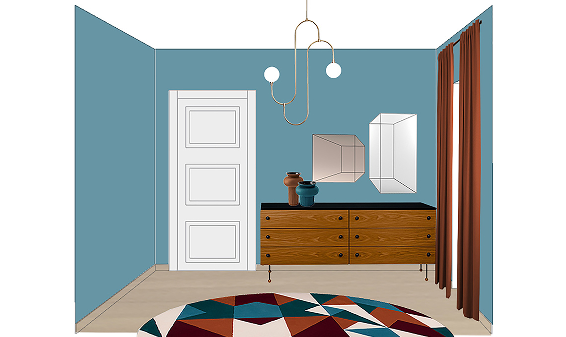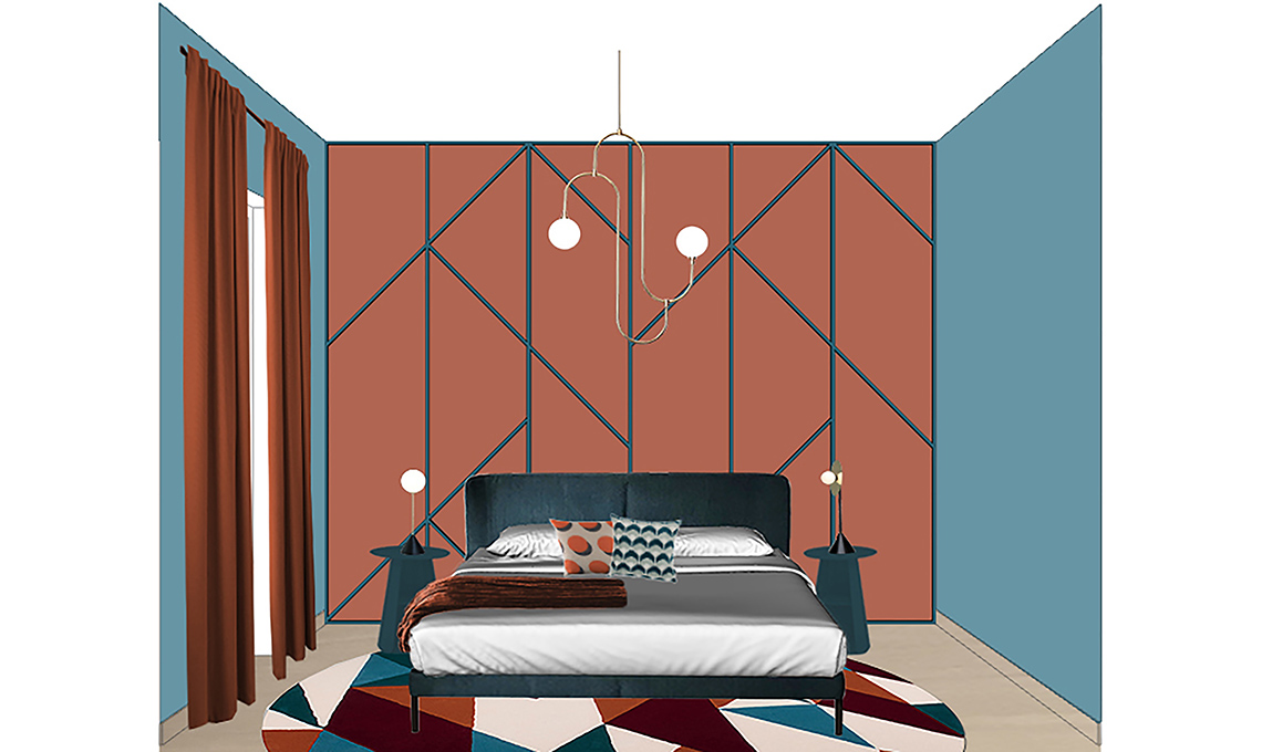Dietro al tuo letto starebbe benissimo anche una boiserie moderna, con ‘tagli’ geometrici. Può essere materica o anche dipinta (effetto trompe-l’oeil), realizzala però color rame e poi ‘raffredda’ questo colore, metallico ma caldo, con un azzurro polvere.