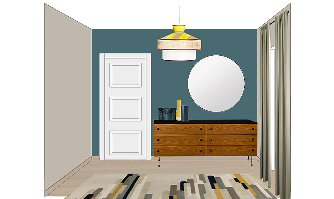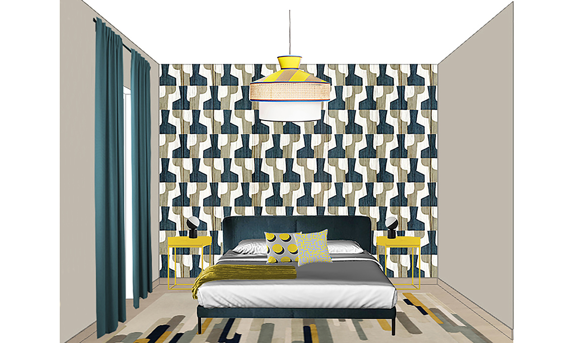 Animo nostalgico, ma allegro? La tappezzeria con il decoro Anni ’70 dietro al letto è perfetta! Puoi completare la palette con un giallo squillante da richiamare in pochi elementi (comodini, lampadario e vaso) e una base color petrolio più ‘tranquilla’.
