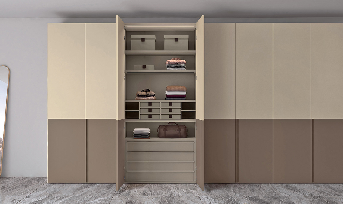 LeWitt ha le ante a battente in laccato opaco avorio e visone con maniglia a gola [Febal Casa, su progetto].