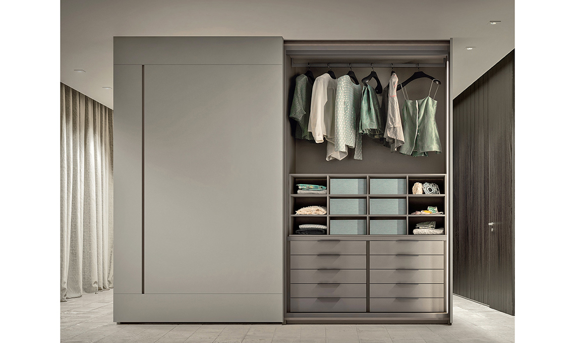 Mixer qui è in laccato opaco Platino con 2 ante complanari Glide con sistema di chiusura assistita [Alf DaFrè, misure e prezzo su progetto].