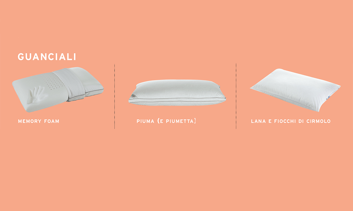 Anche tra cuscini e guanciali hai grande scelta. Un esempio? I modelli in memory foam, quelli di piuma e piumetta o il guanciale con lana e fiocchi di cirmolo.