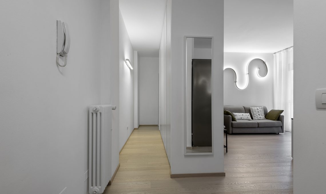 Dietro la quinta con lo specchio si nasconde l'armadiatura multifunzione: prima il corridoio era uno spazio sprecato, ora grazie all'armadio di 3 metri realizzato su disegno dell'architetto c'è posto per cambio di stagione, ripostiglio e lavanderia.
