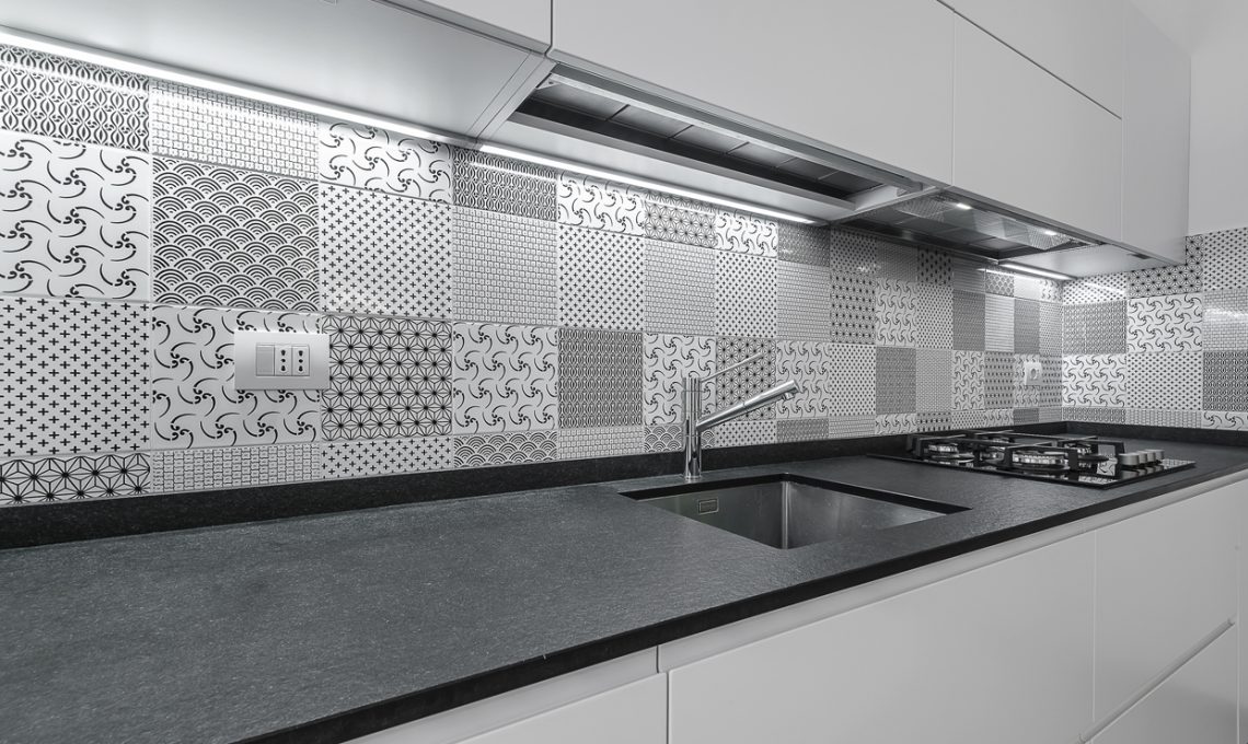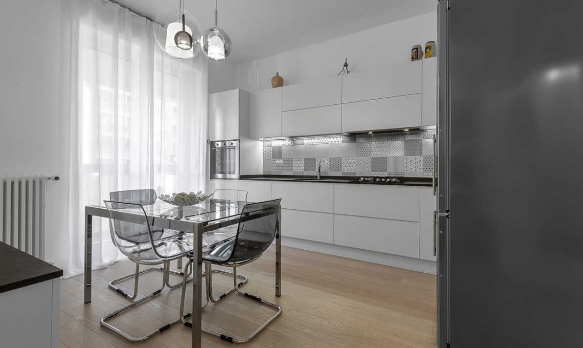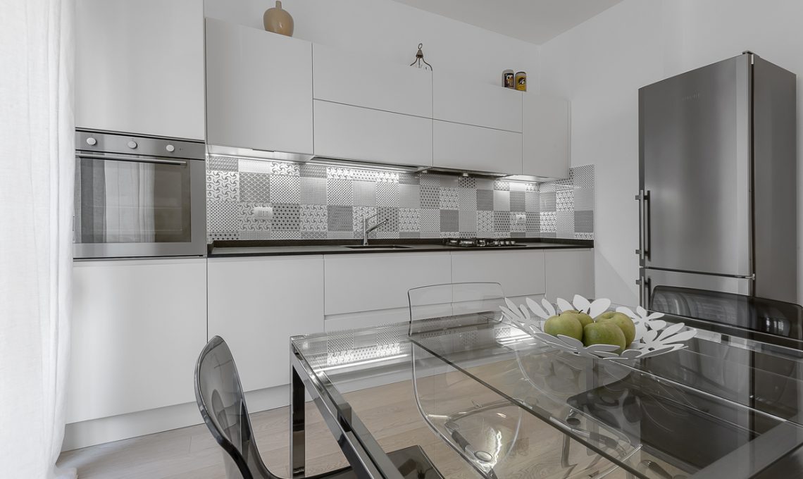Il total white della cucina è spezzato solo dal lungo piano nero con lavello sottoincasso e piano cottura in acciaio e dalla parete tra basi e pensili, rivestita con piastrelle a decori in bianco e nero [Made a Mano].