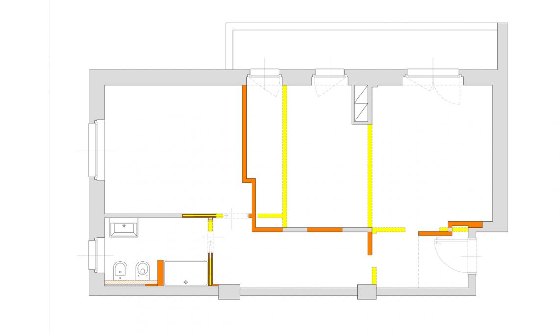 La camera era enorme, il soggiorno piccolo e il disimpegno 'sprecato'. Riproporzionando le stanze, il bilocale è più funzionale e ci sta anche un nuovo grande armadio in corridoio