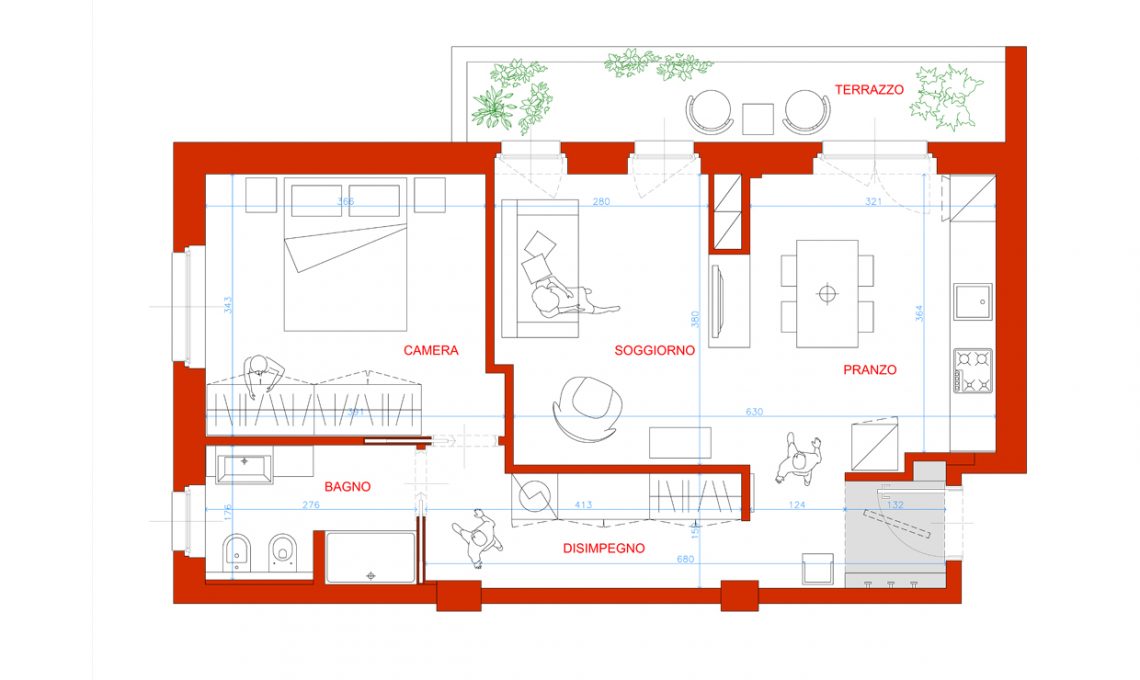 Marta ha comprato questo bilocale 12 anni fa e aveva deciso che, per un po’ di tempo, non avrebbe fatto lavori anche se gli spazi non la soddisfavano del tutto. Ora ha chiamato il nostro architetto CF style che, con poche ma sostanziali modifiche, ha progettato la casa su misura per lei.