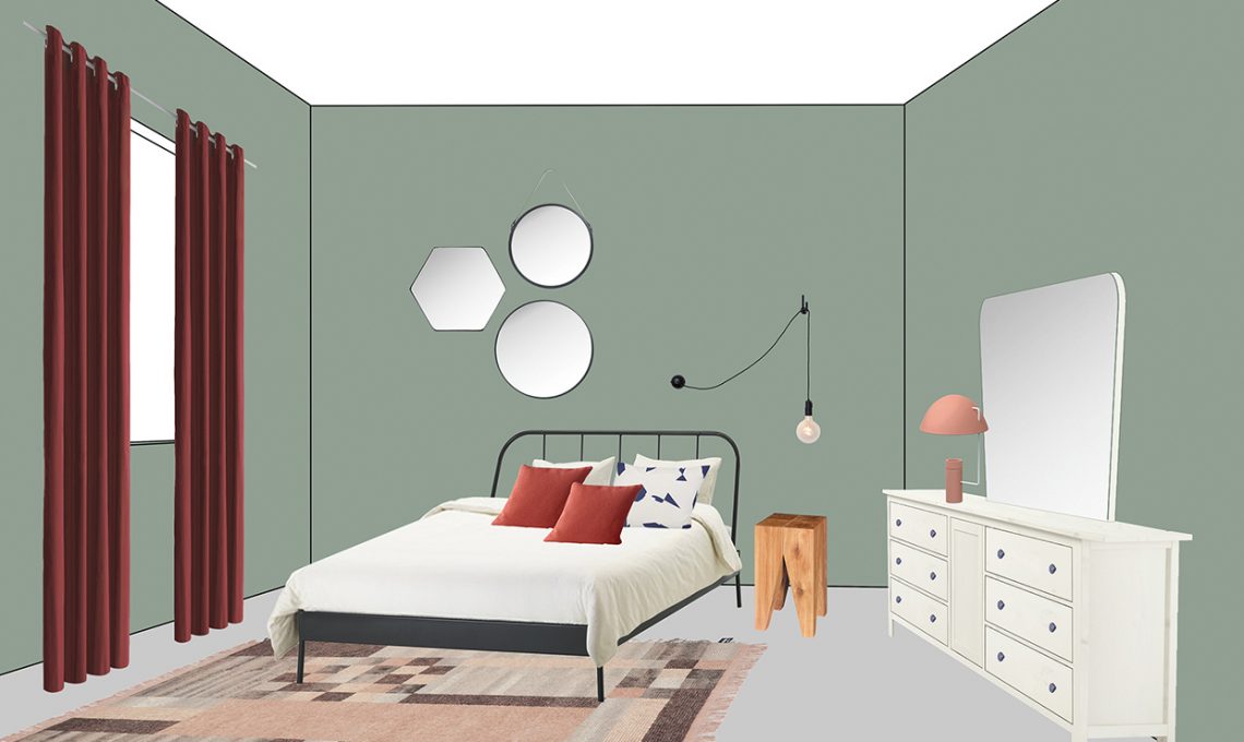 "Suggeriamo a Margherita di abbinare elementi dal design lineare al comò con specchiera della nonna, per dare alla camera uno stile contemporaneo. In più, consigliamo di togliere il vetro verde scuro del ripiano e di dipingere completamente il mobile rétro (dopo averlo ben scartavetrato) con un colore chiaro opaco per legno. Infine, potrà anche sostituire i pomelli: meglio sceglierli in uno stile semplice, magari geometrico: l’atmosfera cambierà completamente! E per rendere più accogliente l’ambiente, abbiamo pensato a una palette delicata, abbinando il rosso al rosa pastello e il verde per le pareti (ma il soffitto dovrà restare bianco). Visto che Margherita ama gli specchi, le proponiamo anche di creare un gruppo di 3 o 4 elementi a parete, affiancato da una lampada che dia un segno grafico alla stanza. Per completare, abbiamo scelto un tappeto dalle sfumature impressioniste, per un tocco soft ed eccentrico."
