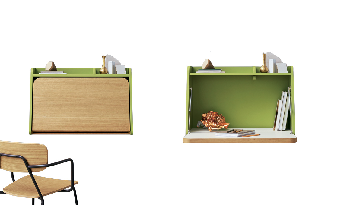 Lo scrittoio a ribalta da parete non ingombra quando è chiuso e, quando si apre (con un tocco) è abbastanza profondo anche per chi è in carrozzina.