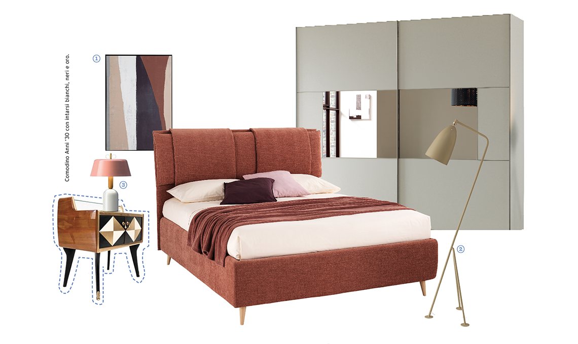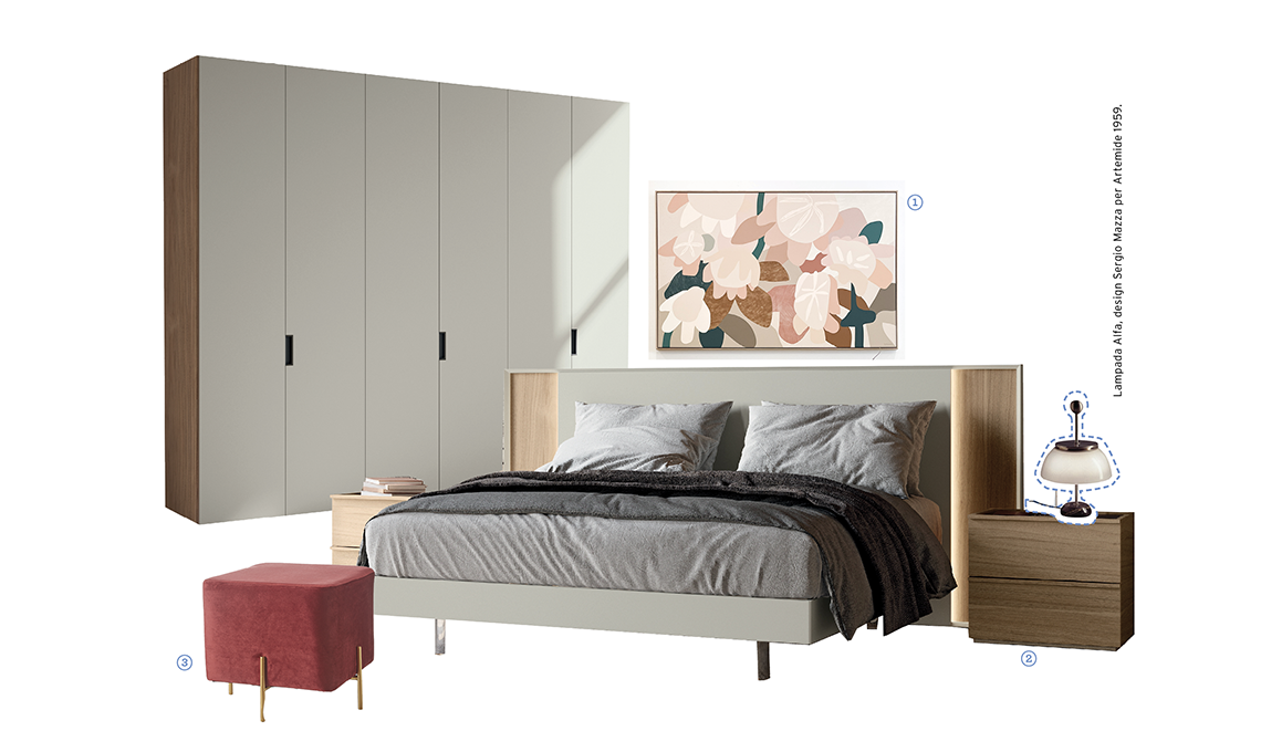 Letto Nouvelle e Armadio Barret [Febal Casa], 1 Stampa Dreamer limited edition di Kimmy Hogan [Norsu Interiors, da cm 110x170]. 2 Comodino Gae in nobilitato Noce gold con top laccato antracite [Febal Casa, cm 54,6x45,2x50h]. 3 Pouf Ada rivestito in velluto rosso [Conforama, cm 37x37x34h].