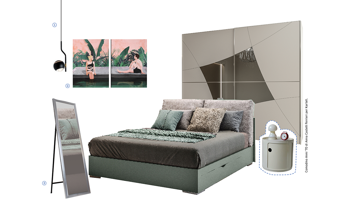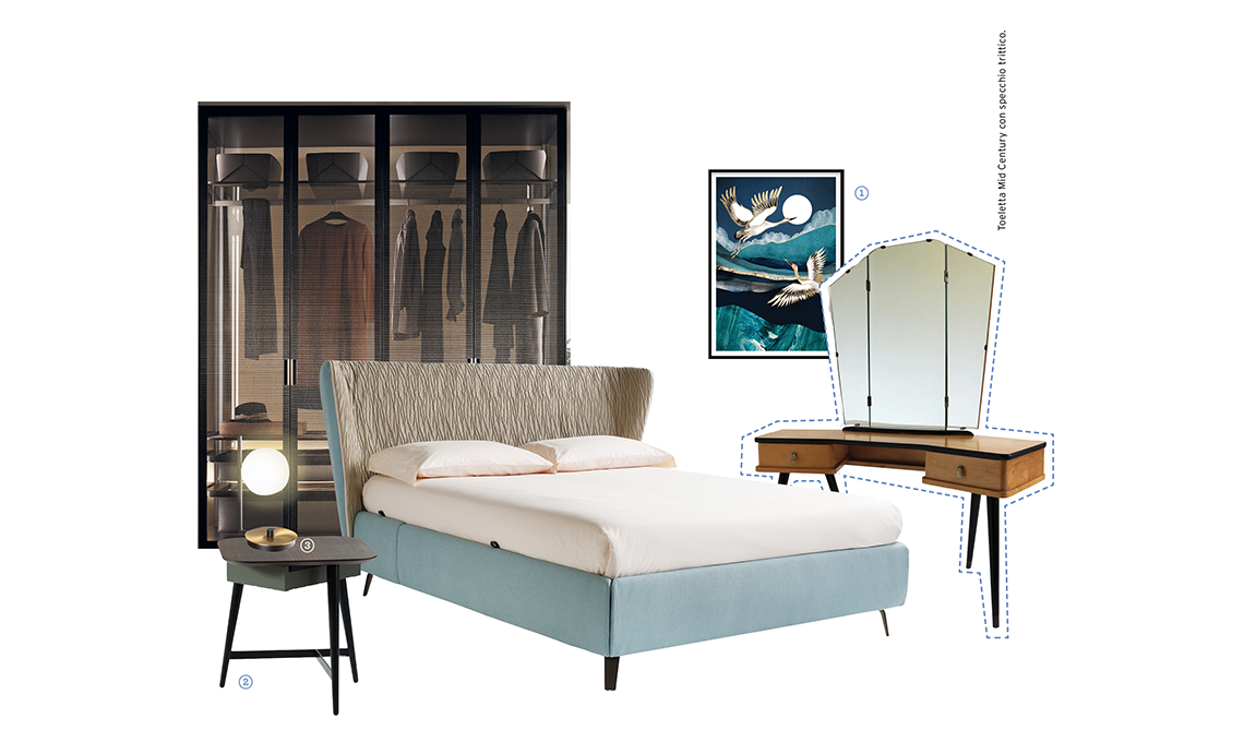Lo specchio ‘con le ali’ suggerisce un letto imbottito dalla testata avvolgente e un armadio sofisticato con ante bronzate. I complementi? Con dettagli preziosi.