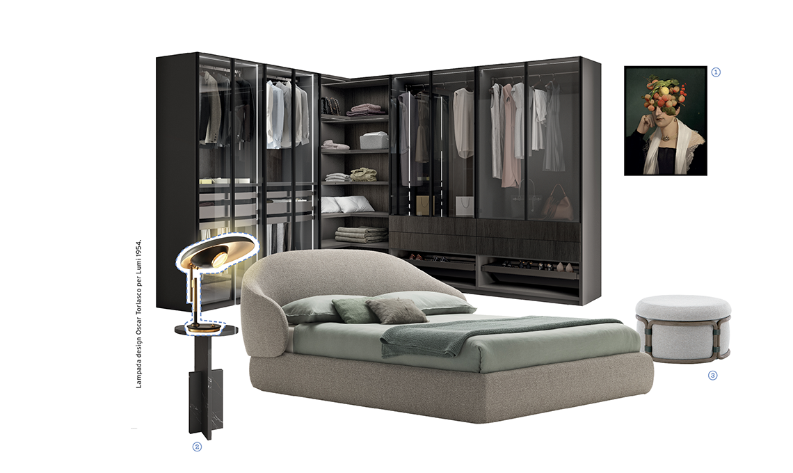 Armadio Walk-in Fluida [Scavolini], letto Yume [Alf DaFré, cm 192x230x102h]. 1 Stampa Collector Portrait Camille [Ibride, cm 64x84].