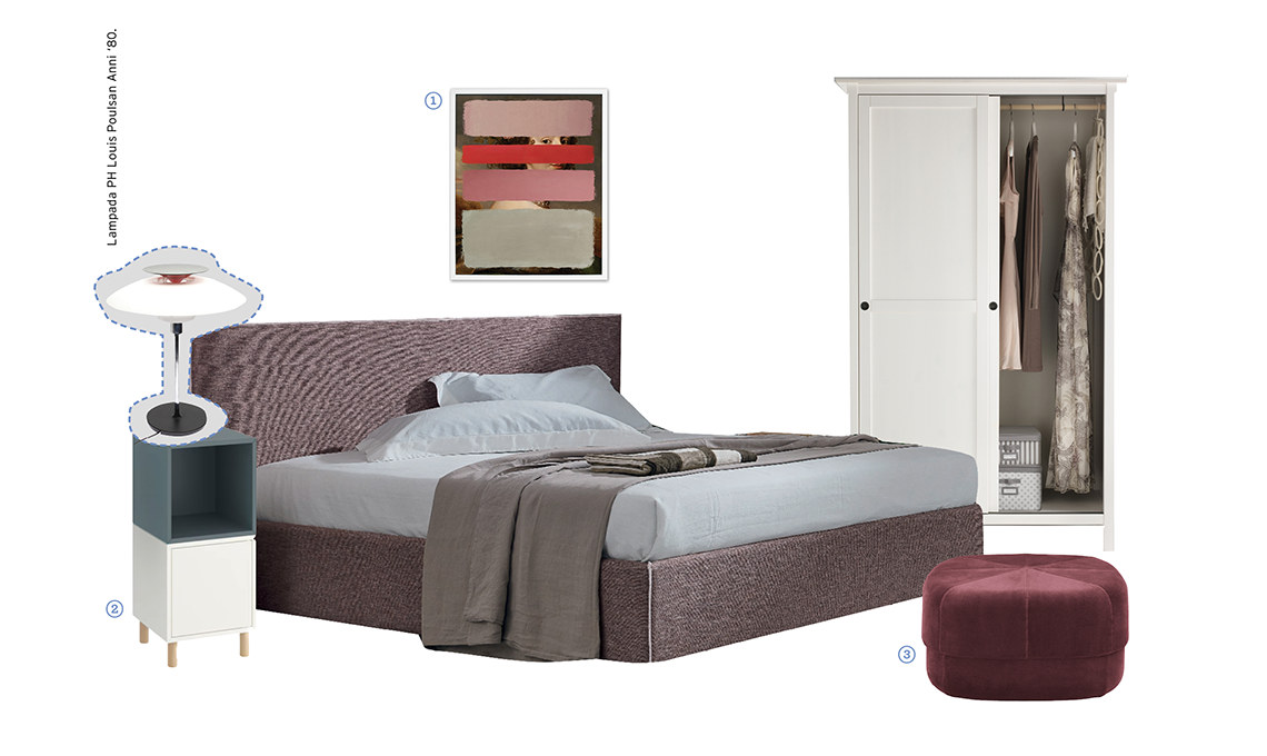 1 Quadro Colours - Red & Pink in edizione limitata [Mineheart, cm 66x 81,3]. 2 Comodino Eket [Ikea, cm 30x30x80h]. 3 Pouf Circus [Normann Copenhagen, cm 65x65x35h].