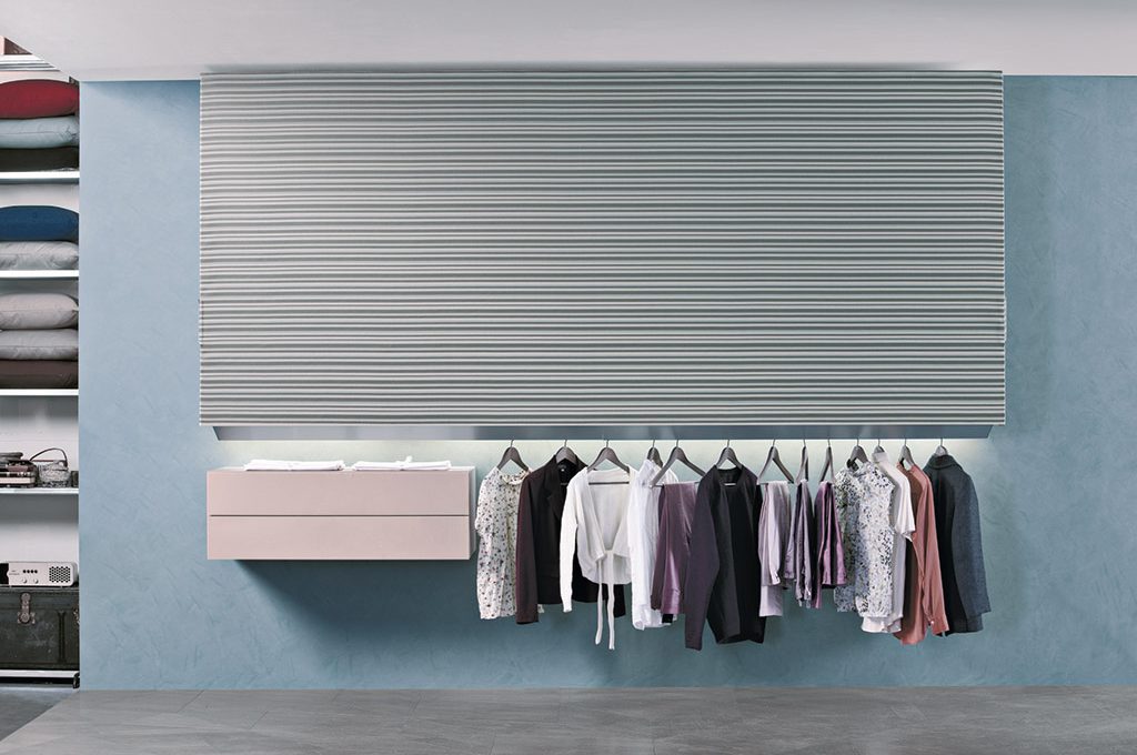 Ma la vera rivoluzione sta nel sistema di chiusura del contenitore: un'unica tenda, in un tessuto speciale che non lascia entrare la polvere, scorre su apposite guide e si tende sul contenitore. Et Voilà - è il nome decisamente esplicativo di questo sistema - con un gesto semplicissimo e veloce l'armadio si apre e si chiude per intero.