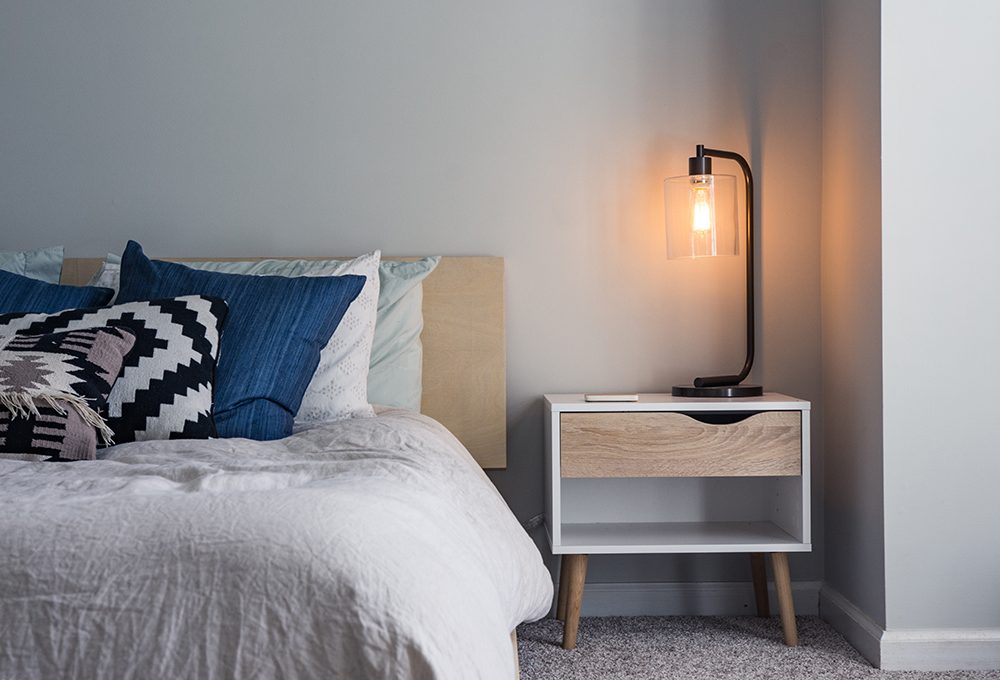 Il giroletto sottile nasconde un contenitore a scomparsa e come tocco di décor essenziale c’è la doppia tonalità che crea contrasto, nel profilo della testiera, sulle lenzuola e sui trapuntini.