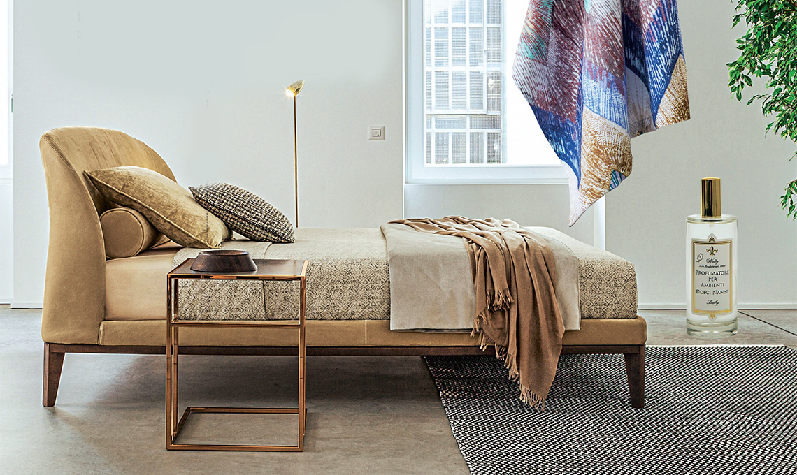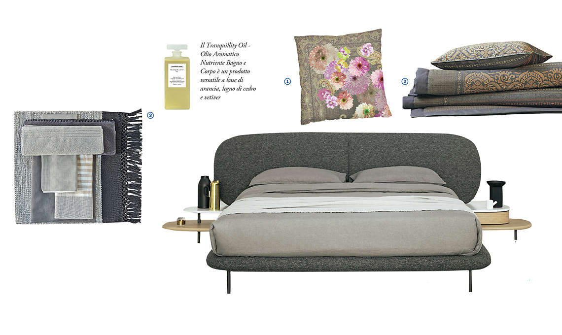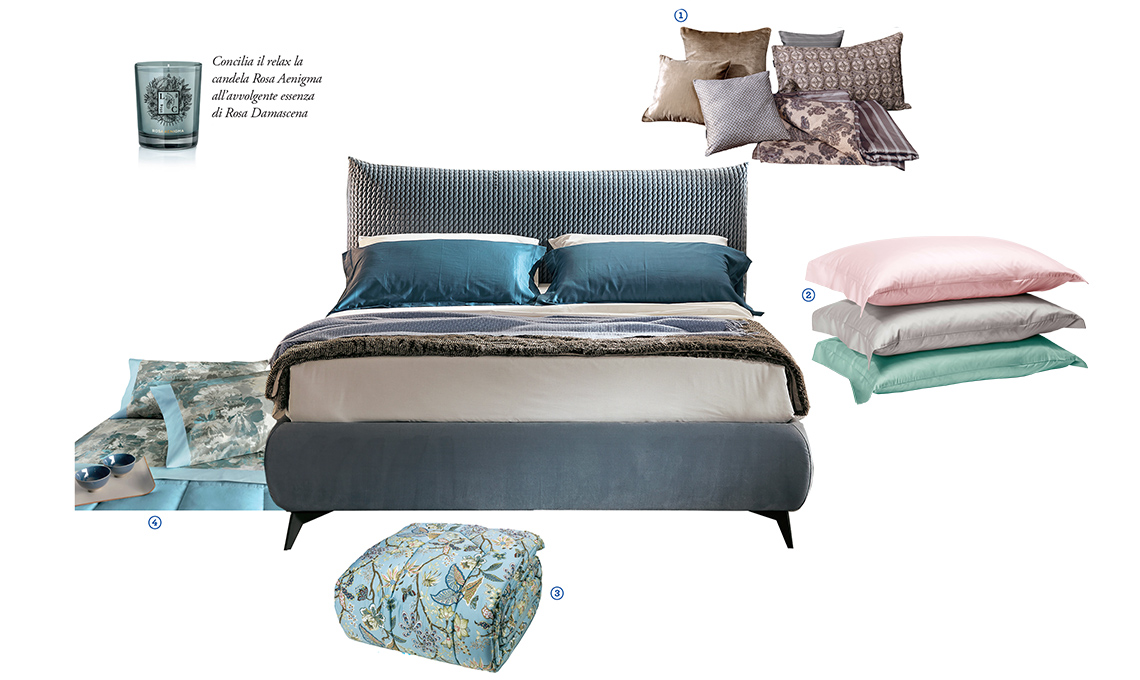 Un letto che è un ‘sistema’ per il benessere (letto+rete+materasso+cuscini) e ha una testiera che dona personalità all’ambiente. Ideale il mix con tessili setosi al tatto, con pattern geometrici e fiorati.