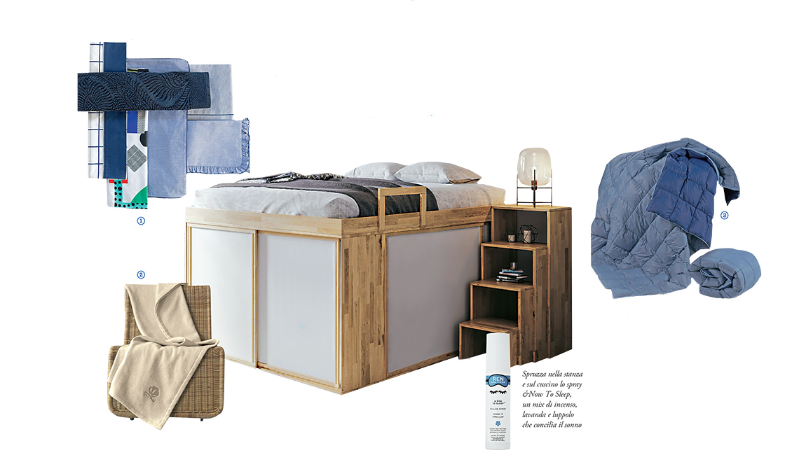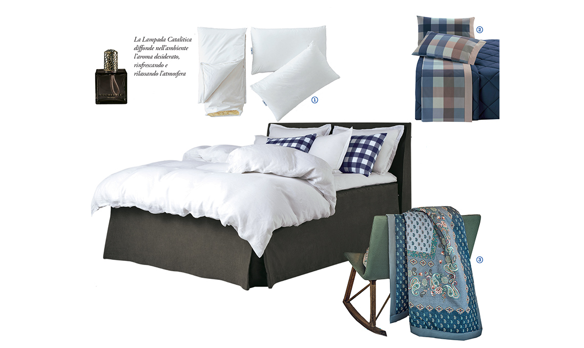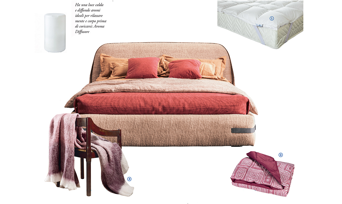 Aroma Diffusore di [Muji €64,95]. Letto Tape [Novamobili, cm 180,5x228x95h €2.179]. 1. Coprimaterasso Nuvola Ultrasoft [DaunenStep, cm 170x200 €769]; 2. Pattern geometrico per il rivestimento del plaid Soft [Cinelli, cm 130x180 €150]; 3. Plaid coll. Zucchi Easy Chic [Zucchi, cm 135x