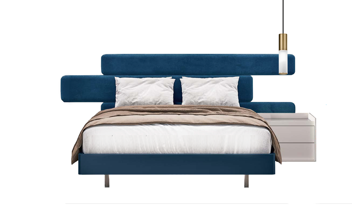letto Desire con morbida testata a bande rivestita in tessuto Sinfony Steel più giroletto in laccato opaco Oceano [Febal Casa, cm 283x199x156h], lampada Etoile qui nella versione a sospensione, ha corpo ottone e diffusore in vetro borosilicato [Il Fanale, ø cm 6x27,9h] e comodino della serie Trend dal mood minimale con 2 cassetti in finitura pomice con top in vetro pomice opaco [Zalf, cm 77,4x49,2x 47,7h].