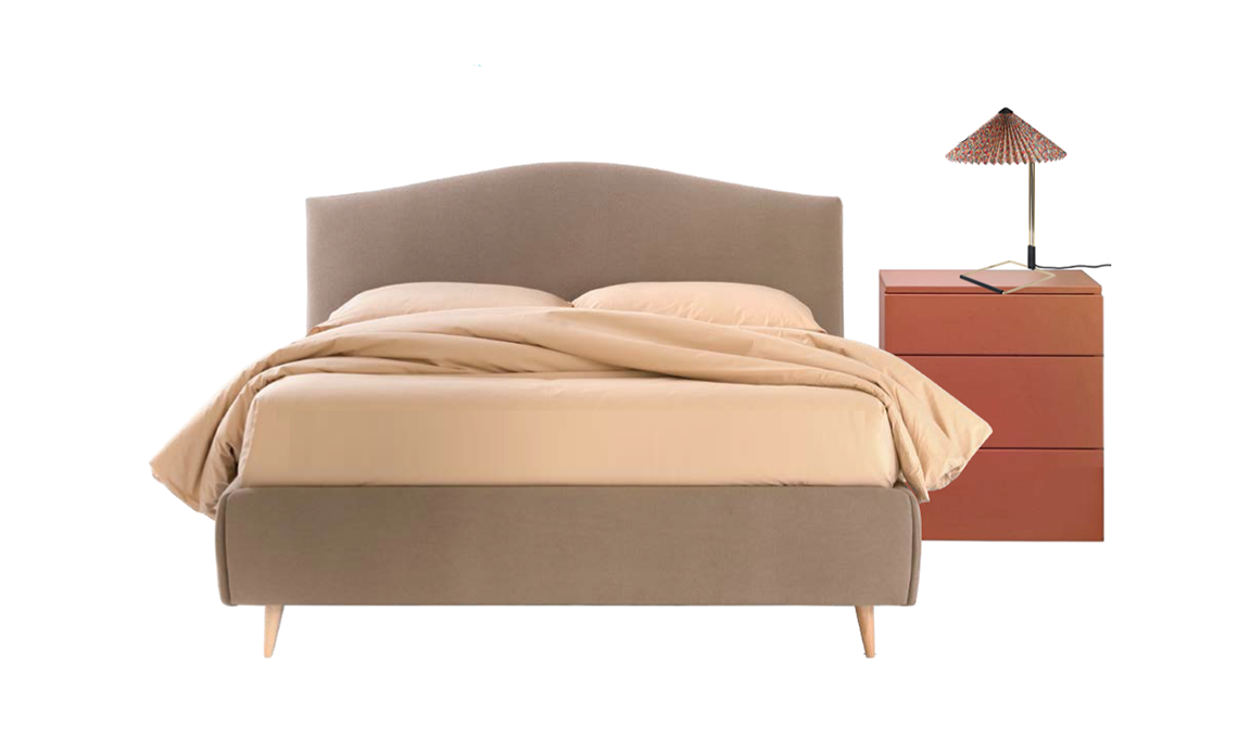 letto Lyle Modern con testiera e giroletto imbottiti e rivestiti in tessuto Fluff 0021, qui dotato del sistema contenitore Pop Up [Noctis, cm 177x223x117h], lampada Liberty Matin con paralume plissettato in tessuto laminato [Hay, ø cm 30x38h] e comodino Florens dal profilo minimale con 3 cassetti in laccato opaco terracotta [Lema, cm 44,7x46x55,1h].