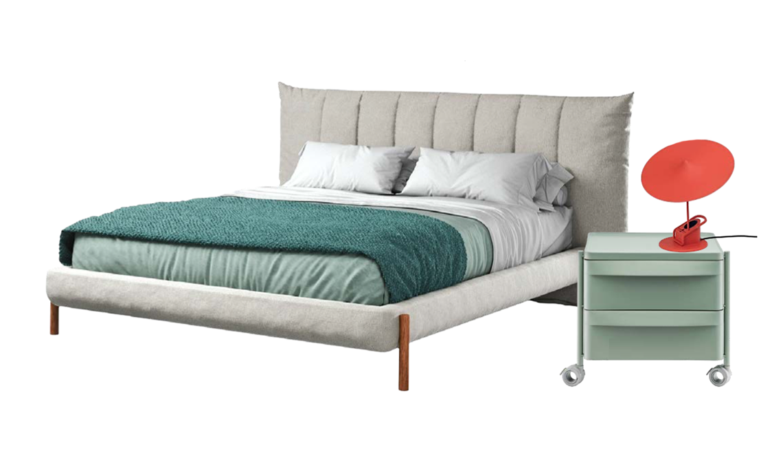 letto Groove con grande testiera imbottita a cuciture verticali abbinata a un giroletto essenziale con sottili gambe in noce canaletto [Novamobili, da cm 221x230x114h], lampada da tavolo w153 Île in alluminio e PMMA rosso ha il paralume a snodo sferico per orientare la luce dove si desidera [Wästberg, ø cm 20x19h] e comodino Boxie in acciaio e polipropilene: ha ruote piroettabili e bloccanti