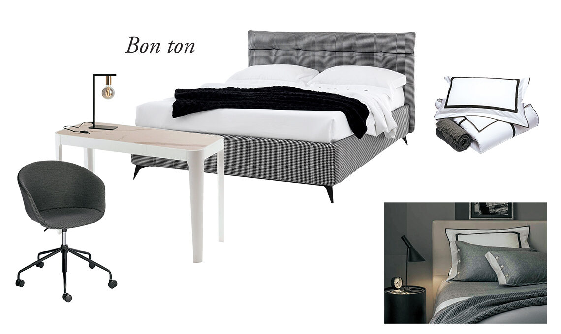 Il pied-de-poule, simbolo di un’eleganza senza tempo, è valorizzato da dettagli, decori e tessuti glam in bianco e nero. Come vestire il letto? Con un letto dal decoro importante le lenzuole ideali sono raffinate negli stessi colori, caratterizzate da semplici cornici nere su base bianca e completate da copriletto o plaid grigio in tinta unita.