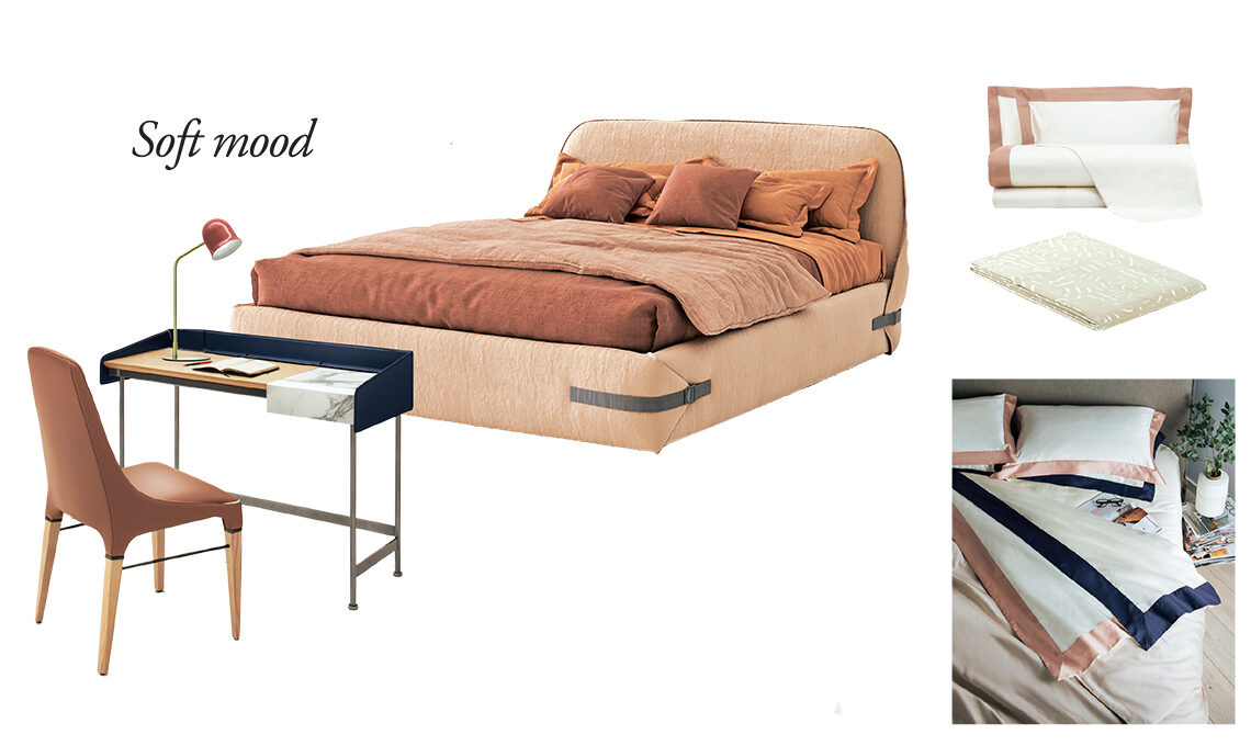 Le linee morbide e soffici, oggi assolutamente unisex, si fanno ancora più avvolgenti grazie al color cipria. Come vestire il letto? Un letto così accogliente e morbido, rivestito in lino, quindi molto materico, chiama lenzuola effetto seta, leggere e preziose. L’eleganza è garantita da una tinta unita avvolta da profili in tonalità en pendant o a contrasto con quella del letto.